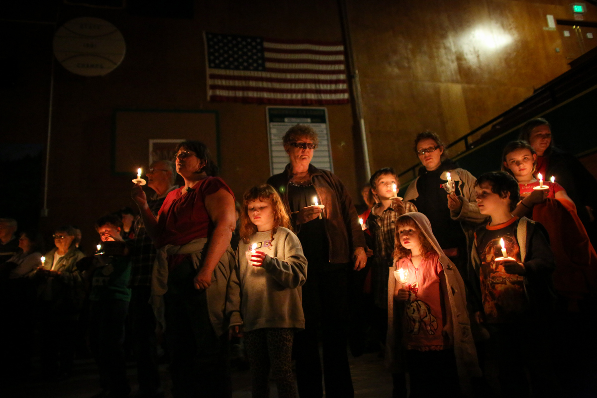 Oso residents hold candles during a vigil at the Darrington Community Center on Saturday, April 5, 2014. The vigil was held on the two week anniversary of the mudslide and was attended by thousands. (Joshua Trujillo, seattlepi.com)[/caption]