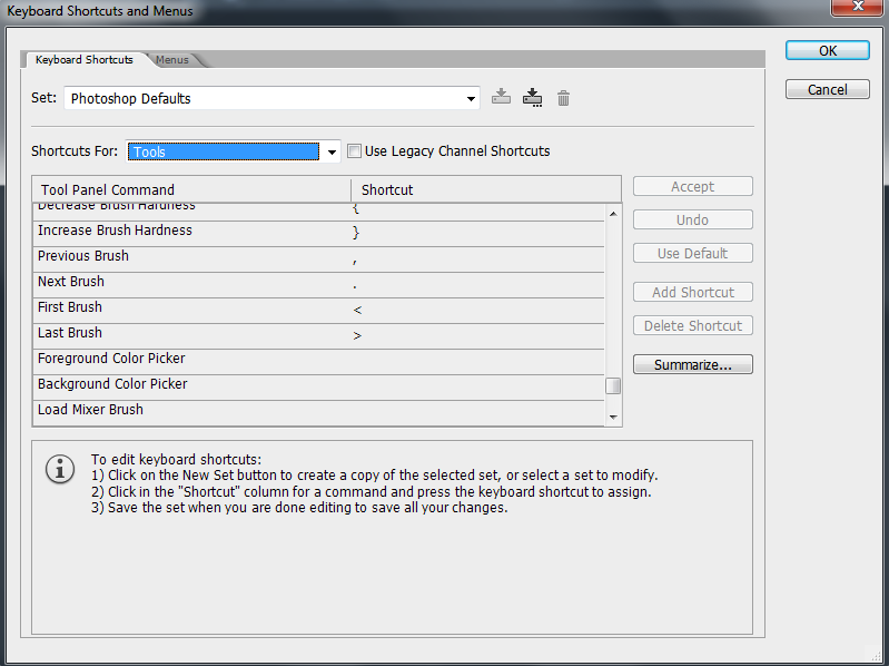 When adding a shortcut to a Tool action, you will need to pick a single key, not a combination of keys. You can also now assign shortcuts to the “Foreground Picker” and “Background Picker.” This feature became available when Adobe released Photoshop CS5.
