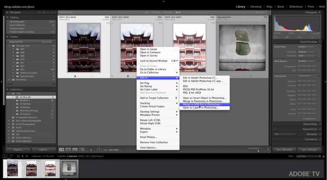 Once all the files have been imported into Lightroom, make the necessary adjustments and lens corrections to each image. Instead of exporting, in the Library module, right-click and select Edit In > Merge to HDR Pro in Photoshop.
