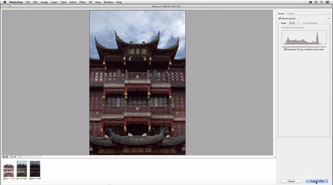 All images will then load directly into Photoshop using the best-exposed area of each file combined into a single image. In the preview window, select 32 Bit in the dropdown Mode menu instead the default 16 Bit. This allows for the new “Complete Toning in Adobe Camera Raw” option to be selected. Check the Remove ghosts box and click Tone in ACR to continue.