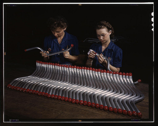 Another Palmer photo, this one shows women at work on a bomber at the Douglas Aircraft Company in Long Beach, California.