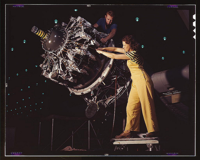 The Library of Congress notes that women like these two were "trained to do precise and vital engine installation detail," which was essential to the American armed forces during the war.