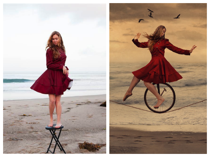 During all this focused detail work, don’t forget about your face. Brooke asked for a soft expression – as if the balancing act was effortless for the girl I was portraying. I softened my brows, tilted my chin up, and gave the slightest pout to my lips. It was almost a peaceful, dainty, face – an expression that projects calm confidence. You could imagine it on a china doll – yet, it’s worn by a girl performing an extremely difficult task, riding a unicycle on a tightrope. It was this delicate, weightless pose that takes the subject from a model, or “cool, it’s Katie on unicycle”, to a character with a story and life all her own. Brooke took care of the rest.