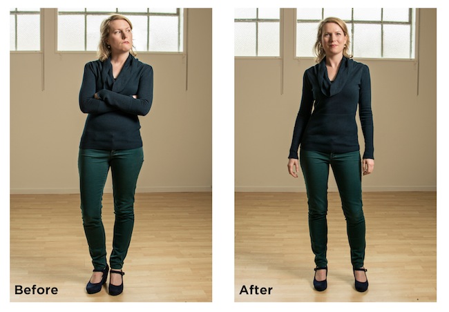 There are three body language tips you can immediately implement to improve your body language. First, leave your torso unblocked—uncross arms and put down purses or cell phones. Second, look level. When you tilt your head back and look down your nose at those around you, it sends off a very negative first impression. Lastly, stand equal and wide. Firmly planting your feet to be balanced and strong not only looks more confident, but also makes you feel more confident.