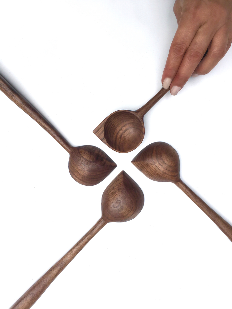 Her studio is a one-room cottage in her backyard in San Francisco’s Mission District. It’s a tight space, so she often works with the doors open, using hand tools to craft her spoons. “The curves and organic shapes you can make with hand tools is wonderful, and the second I had the gouge and rasp in my hands, I thought, ‘This is it. I love how this feels.’ When I started making my spoons, I quickly evolved a style that I hadn’t seen before (the right angle corner that is both practical and beautiful),” she says.