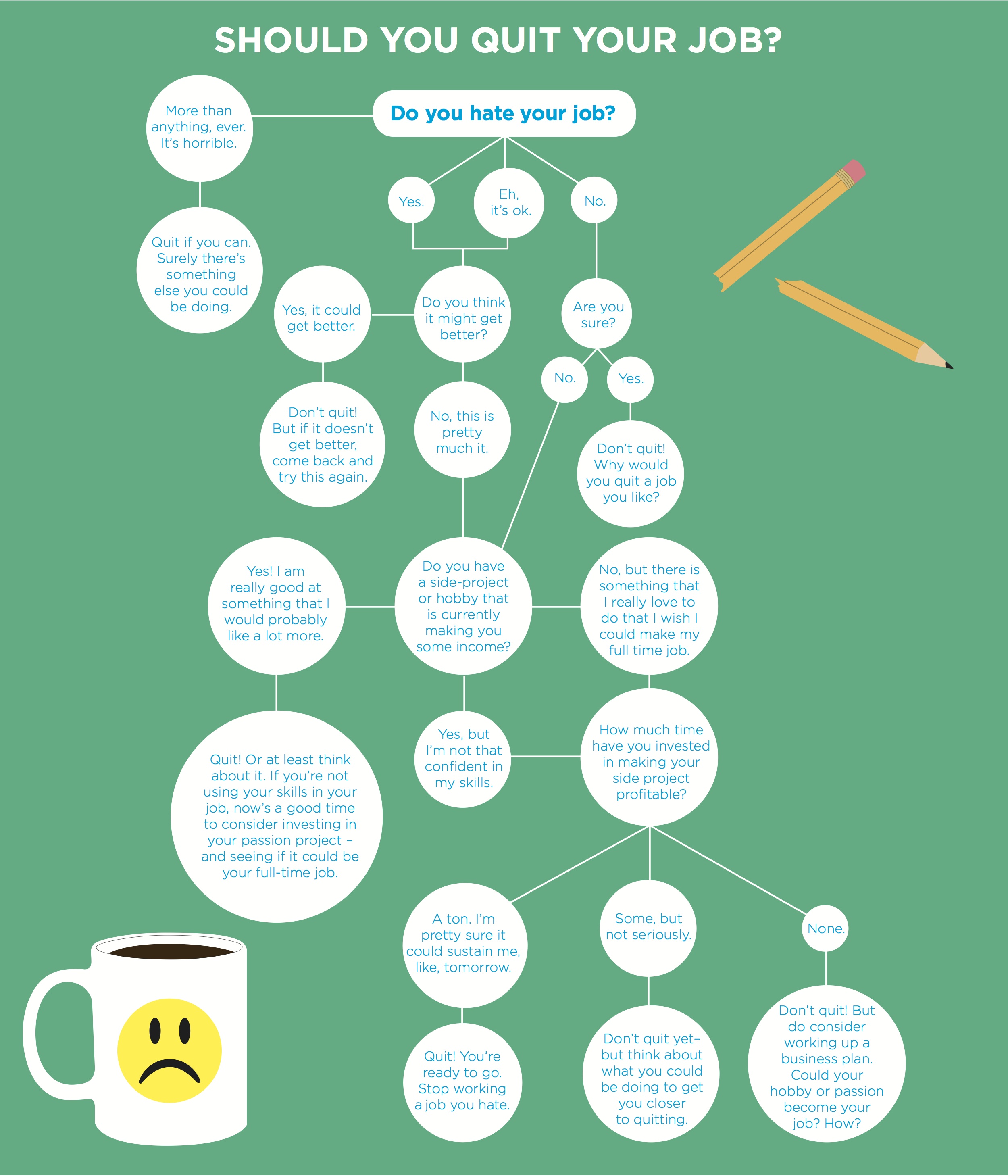 In the end, how do you really know if you're ready to jump into the world of self-employment? To help you make that call, we've designed this infographic to walk you through the process of deciding whether you should, in fact, quit your job. Of course, this process may not hold true for everyone, but it'll be extremely helpful as you weigh your options and consider all of the potential outcomes heading your way.