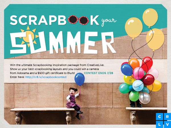 Go for a theme within a theme: "Summertime" is the general theme of your seasonal scrapbook, but how else can you divide it up? Becky Higgins recommends pulling from some of the most popular themes, including travel, holiday, or project. Consider doing pages for events of all sizes, whether it be sports teams, camping trips, holidays, favorite barbecue recipes, yard improvement, or whatever else you've been up to this summer. Forget about perfection: Sunburned noses, bumped knees, and other "imperfections" are common sights in summertime photos. And while you could spend a lot of time in Photoshop trying to get the ice cream stains off your kids' shirt, it's really not necessary. "As a recovering perfectionist myself, I completely get it," says CreativeLive instructor Lain Ehmann, "You sit down to scrapbook and maybe your photos are a little out of focus, or you don’t have the perfect cardstock to match your ribbon, or you don’t know where to put things on your design… and you know what? Life isn’t perfect." Instead of focusing on how to make a perfect scrapbook, aim to make a scrapbook that perfectly tells the story of the summer exactly as it really was. Now that you know what to do, show us what you've got. We are so excited to announce our Scrapbook Your Summer Contest! Show us your most creative layouts and you could win big. We want to see your digital scrapbooking creations or the paper layouts you’re most proud of. Submit your entry right here. We’ve partnered with Adorama and Blurb who gave us some sweet prizes! One winner will receive a Pentax K-50 Digital SLR Camera with a 18-55mm Lens ($596.95) from Adorama, think about all the great summer vacation photos you’ll be able to snap with this beauty! Another winner will get a $500 gift certificate to use on Blurb, perfect for printing out books of your digital scrapbook layouts. And if you tune into Jared Platt's course airing now through 6/27 you can find out how to master Lightroom for scrapbooking! To enter to win simply head to our contest page and submit your entry. This contest ends on July 28th so you have a month to enter. In the mean time be sure to check out our scrapbooking classes and RSVP now for Megan Hoeppner’s From App to Archive: Social Media Scrapbooking, and learn how to turn those instagram photos into lifelong keepsakes. We'll announce the winners on this blog post on July 29th. Good luck! *Congratulations to our winners! Cathy P. & Frances P.! You can view both of their entries right here.*