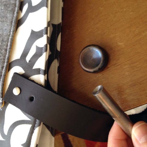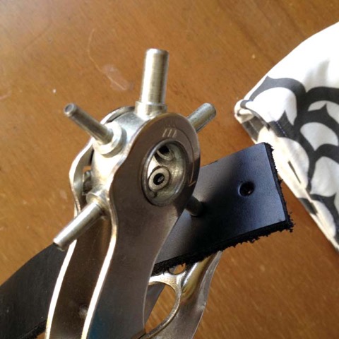 Next, punch a hole in the leather at each marking, big enough for the post of your rivet. There are also single hand punches available at leather goods stores. Copy this placement and punch holes in the other end of the handle.