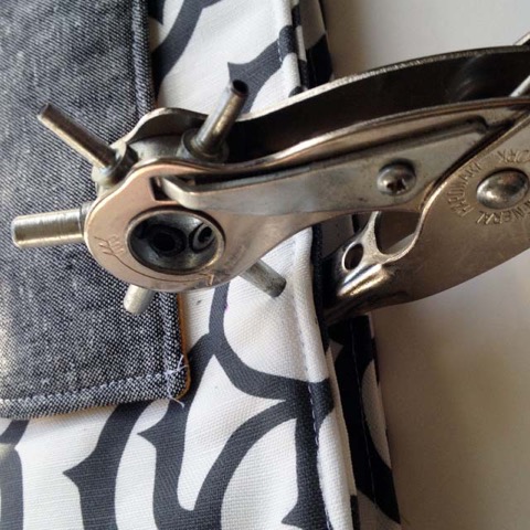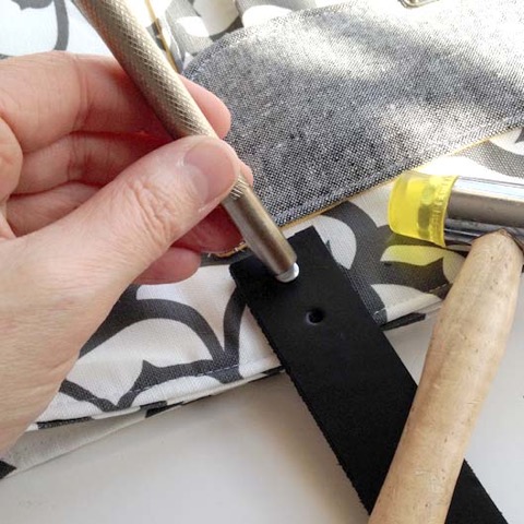 Repeat for the second rivet, then the other end of the handle, making sure that it isn’t twisted. Copy your placement to the back of the bag and set the second handles in the same manner.