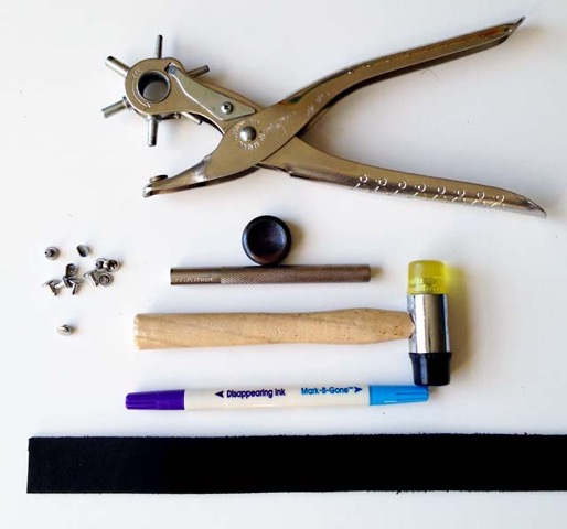 Top to bottom in the photo above, we have an adjustable hole punch, an anvil and rivet setter, a mallet, and a disappearing ink marker.