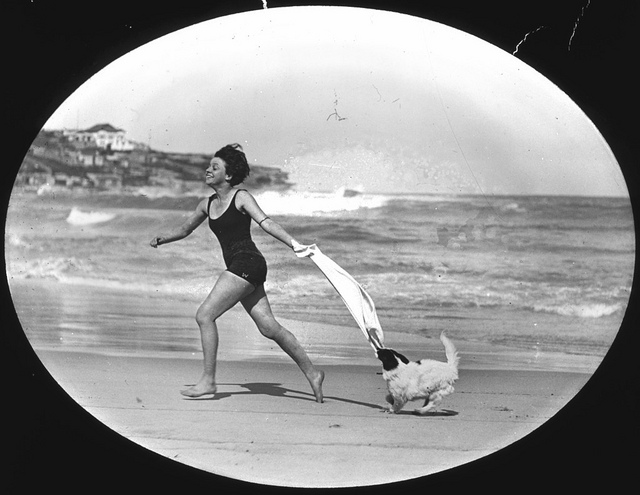 "Miss Watts running on Bondi Beach with a dog, New South Wales, 1925," via photographer M. H. Robinson. According to