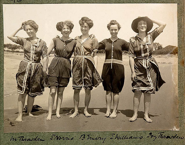 The State Library of Newbrunswick provides this photo, "Women in bathing suits on Collaroy Beach, 1908," which has been repurposed many times. The women were photographed by Colin Caird.