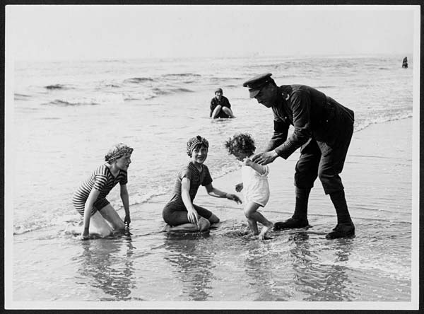 "French children playing with a British soldier on a beach, France, during World War I. Dressed in the long and stripy swimsuits that were traditional in this era, these French children are enjoying playing in the water with a British soldier. After taking part in fighting at the front line, this peaceful experience of playing around with children on a beach at a French resort, may have been a rather strange feeling for the soldier involved.
