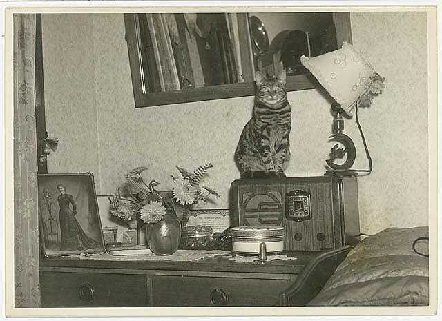 Hood also just photographed animals, sometimes, like with this portrait of a cat perched on a radio.