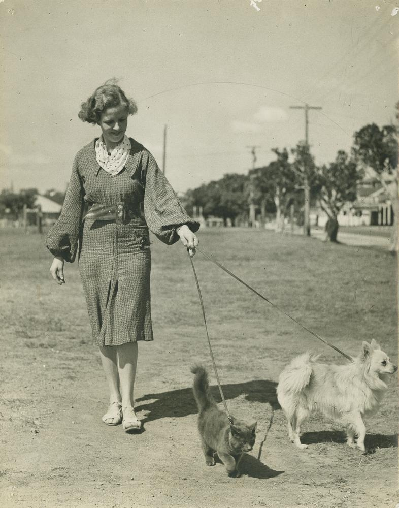 "A young lady takes both a dog and a cat for a walk whilst they are attached to leads," writes the State Library of Queensland about this photo, by George Jackman. Jackman has an expansive photoset on Flickr; most of his photos are of Queensland life in the 1930s. He specialized in portraiture and lifestyle photography, though occasionally covered political events.