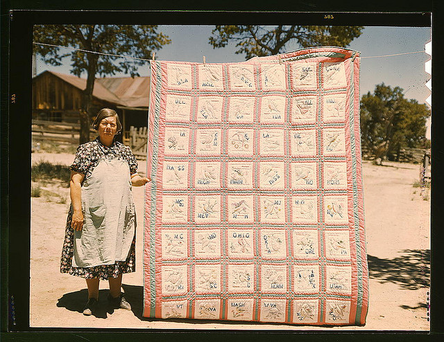 The caption from the Library of Congress: "Mrs. Bill Stagg with state quilt that she made, Pie Town, New Mexico. A community settled by about 200 migrant Texas and Oklahoma farmers who filed homestead claims ... Mrs. Stagg helps her husband in the field with plowing planting, weeding corn and harvesting beans. She quilts while she rests during the noon hour. 1940 Oct."