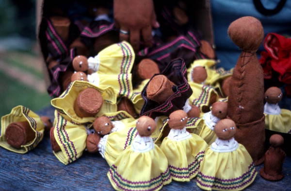 This image shows a collection of Seminole dolls in the process of being made by Mary Billie on the Big Cypress Reservation, Florida. The photos, which comes from Florida Memory, note reads "Mary B. Billie has been a dollmaker since she was 17. She learned the skill by watching her mother, who learned it from Mary's grandmother. Seminoles used to make dolls mainly as toys for their own children, but now Mary, like other Seminole dollmakers, depends upon the craft to earn her living. 'They were for the kids to play with at first. That's what they were making it for, for the kids to play with."