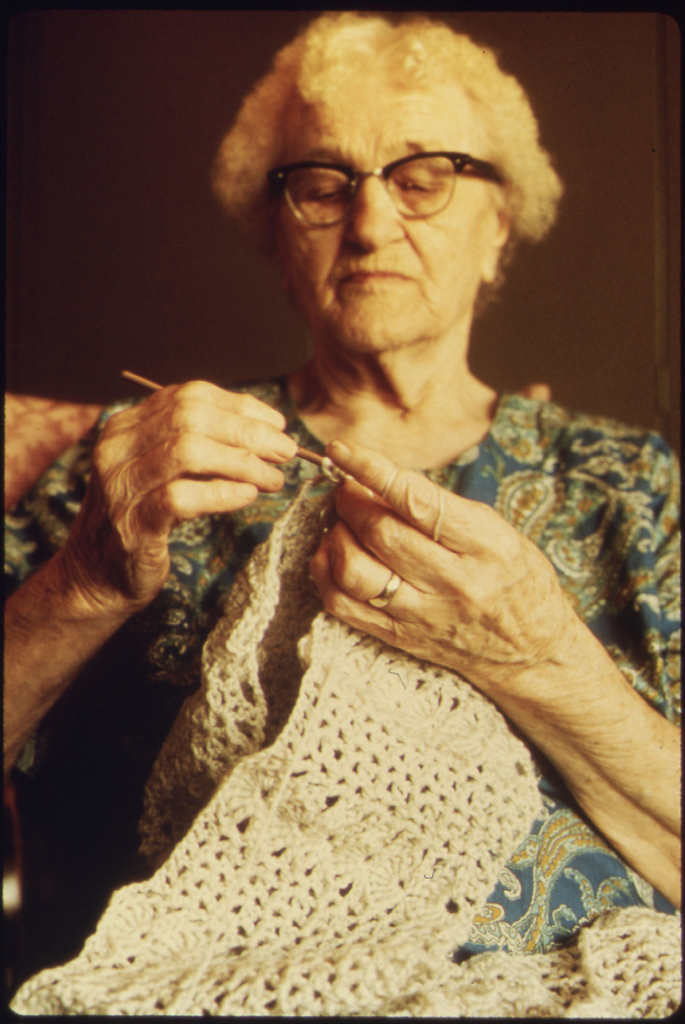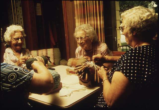 The caption for this photo, from the U.S. National Archives, "Older citizens, retired persons and those unable to care for themselves physically are cared for in two community centers. This woman lives at the Highland Manor Retirement Home, keeping busy with "Old Country" crafts.